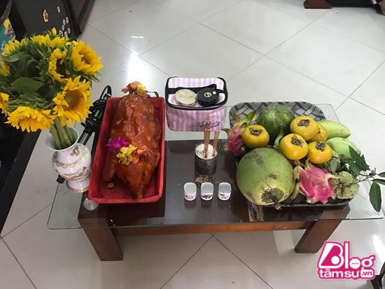 Ngoài heo quay và mâm ngũ quả, cặp đôi còn dâng lễ là mỹ phẩm – “trợ thủ đắc lực” không thể thiếu của giới nghệ sĩ.