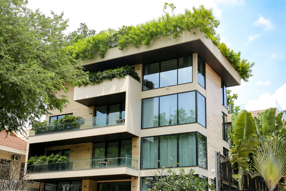 Một góc bên ngoài tòa nhà. Gia đình chú trọng yếu tố sinh thái, thiết kế nhiều khoảng không dành cho cây xanh và hoa kết cầu kỳ.