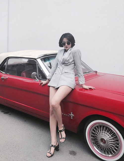 Hiền Hồ diện vest ngắn đi kèm đôi sandals, nữ ca sĩ khoe được chiều dài đôi chân đáng kể khi xuất hiện trong bộ trang phục này.