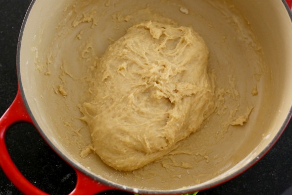4. Mở nắp. Cho một chén rưỡi bột vào nồi gang. Sử dụng muỗng gỗ (hoặc muỗng xới cơm) trộn bột với hỗn hợp sữa + bơ + đường. Trộn không ngừng tay trong vòng một phút. Trộn cho tới khi bột bắt đầu dính và nặng tay.