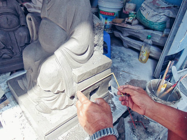 Theo đó, những người thợ miệt mài ngồi làm từng công đoạn đắp cát đổ xi măng để tạo khuôn, chà nhám, sơn màu, khắc họa chi tiết,… Tất cả những công đoạn ấy được tạo ra từ bàn tay tài hoa, khéo léo của người thợ.
