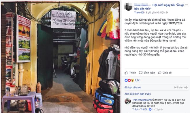 Bức ảnh cùng dòng caption "Tin ấm mùa Đông: gia đình cố nghệ sĩ Phạm Bằng đã quyết định mở hàng trở lại từ ngày 28/11/2017. Ba món bánh trôi tàu, lục tàu xá và chí mà phù - nấu theo công thức người Hoa truyền lại, của gia đình ông xứng đáng góp mặt trong số những mùi vị làm nên một mùa Đông Hà Nội rất riêng. Nhớ đến nao người mùi trần bì trong bát lục tàu xá nóng bỏng tay, cái vị không thể gặp ở đâu khác ngoài góc nhỏ 30 Hàng Giầy." ngay lập tức đã gây bão trong cộng đồng ẩm thực Hà Nội với lượng like tăng nhanh chóng mặt.