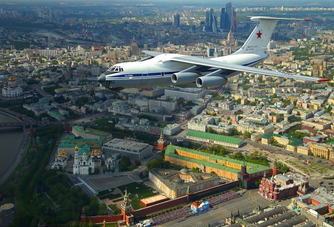 Máy bay vận tải đa năng 4 động cơ Ilyushin IL-76 bay ngang qua khu vực Điện Kremlin, thủ đô Matxcơva. (Ảnh: Alexey Nagaev)