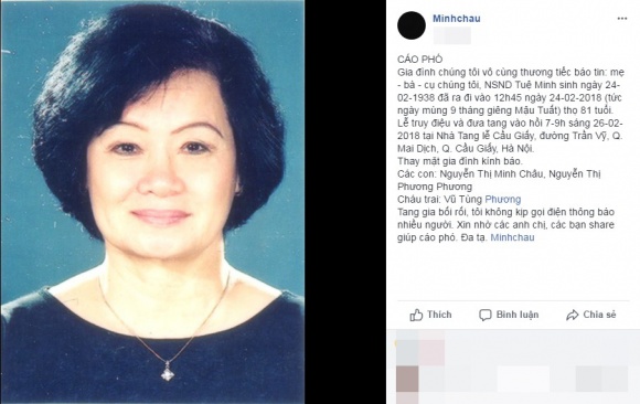 Mới đây, con gái của NSND Tuệ Minh cũng đã đau buồn chia sẻ cáo phó tin buồn: "Gia đình chúng tôi vô cùng thương tiếc báo tin: mẹ - bà - cụ chúng tôi, NSND Tuệ Minh sinh ngày 24.02.1938 đã ra đi vào 12h45 ngày 24.02.2018 (tức ngày mùng 9 tháng giêng Mậu Tuất), thọ 81 tuổi. Lễ truy điệu và đưa tang vào hồi 7-9h sáng 26.02.2018 tại Nhà Tang lễ Cầu Giấy, đường Trần Vỹ, Q.Mai Dịch, Q.Cầu Giấy, Hà Nội".