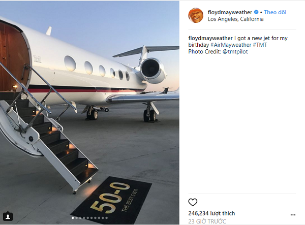Trên trang cá nhân Instagram, Mayweather khoe chiếc phi cơ mới và cũng không quên kèm theo bảng thành tích 50-0 của mình.