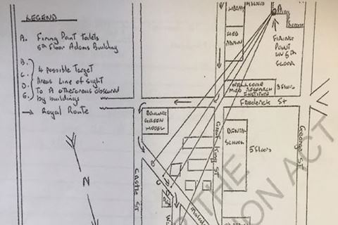 Sáng 14-10-1981, Lewis bấy giờ vẫn đang học trung học, đạp xe đến ṭa nhà 7 tầng Adams Building. Ṭa nhà này được lựa chọn v́ tầm nh́n của nó soi xuống con đường nơi đoàn xe Nữ hoàng Anh đi qua ở thành phố Dunedin, phía Nam New Zealand. Trên tầng 5, từ bên trong một pḥng vệ sinh, Lewis dựng khẩu súng trường cỡ ṇng 22 rifle lấy trộm được đặt lên bệ cửa sổ và đợi chiếc Rolls Royce của Nữ hoàng tiếp cận một đám đông bên ngoài Bảo tàng Otago.