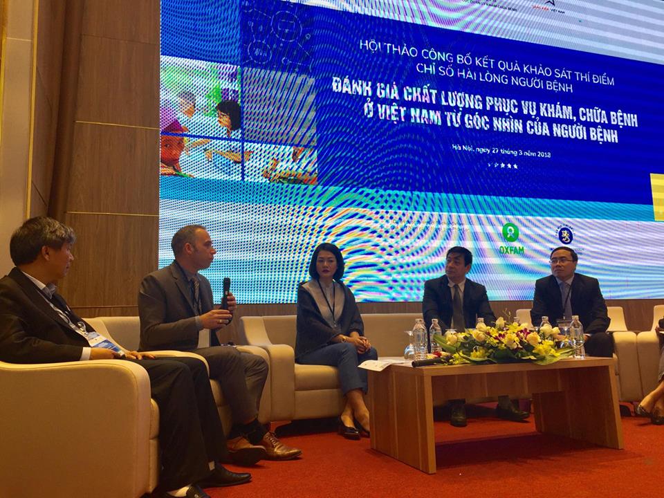 TS Nguyễn Thị Lan Hương- đại diện Sáng kiến Việt Nam cho biết, bệnh nhân được khảo sát dựa trên 13 câu hỏi, 11 tiêu chí với 6 nhóm trên thang điểm 5: Khả năng tiếp cận; Minh bạch thông tin về khám bệnh và điều trị; Thái độ ứng xứ, năng lực chuyên môn của nhân viên y tế; Cấp phát thuốc và hướng dẫn sử dụng; Chi phí khám chữa bệnh; Cơ sở vật chất, phương tiện phục vụ người bệnh.