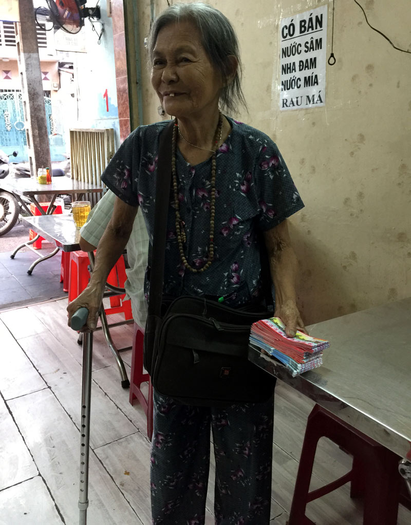 Khách vào càng lúc càng đông. Bà đứng dậy nhường chỗ cho khách. Chúng tôi cũng đã ăn xong, mua giúp bà vài tờ vé số rồi đi.