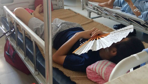 Nằm điều trị vết thương, Vi Văn Thắng lấy quạt che mặt để né tránh những người xung quanh.