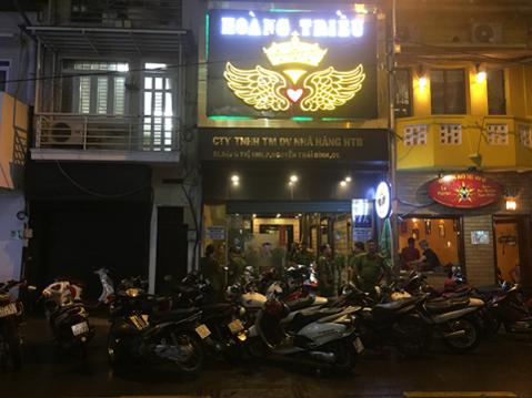 Tối 1-6-2018, hàng chục cán bộ chiến sĩ Pḥng Cảnh sát quản lư hành chính về trật tự xă hội - Công an TP.HCM phối hợp Đoàn kiểm tra liên ngành Văn hóa -Xă hội TP.HCM, Công an quận 1 TP.HCM bất ngờ ập vào kiểm tra hành chính tại nhà hàng Hoàng Triều trên đường Đặng Thị Nhu, phường Nguyễn Thái B́nh.
