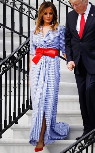 Bộ trang phục kẻ đơn giản với điểm nhấn là chiếc thắt lưng to bản màu đỏ giúp Melania Trump trông thật nổi bật.