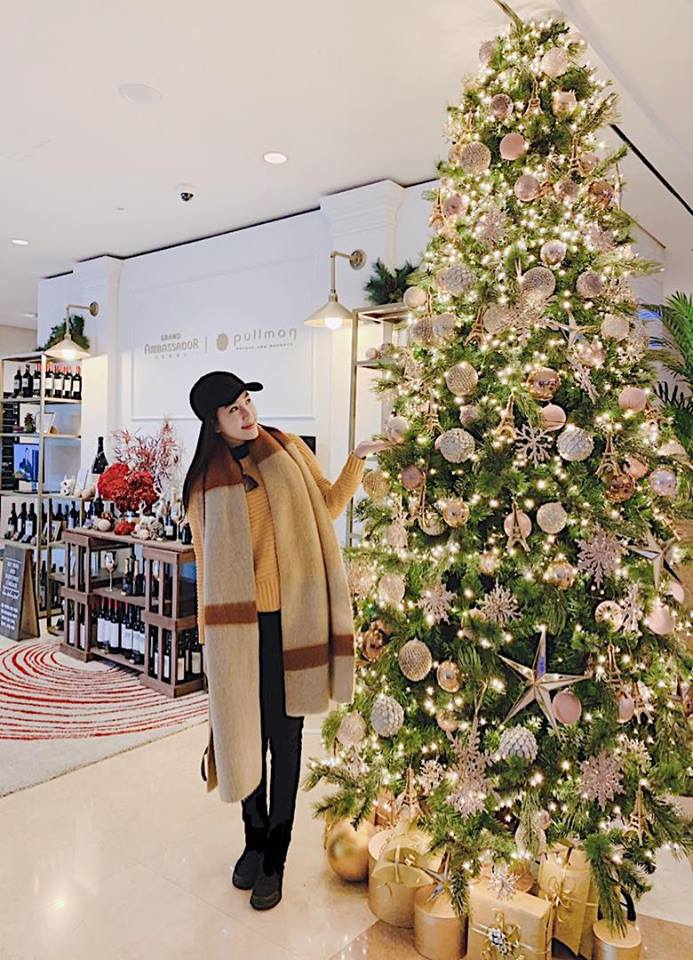 Bảo Thy xinh đẹp trong chiếc áo len màu vàng quấn thêm một chiếc khăn len ở cổ trong chuyến du lịch đến Hàn cùng gia đình.