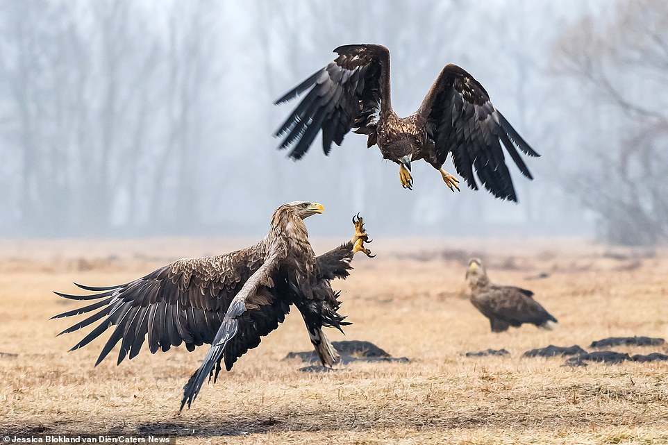 Những bức ảnh cho thấy một trận chiến không khoan nhượng giữa hai con đại bàng khổng lồ diễn ra tại bãi đất hoang ở Ba Lan. Hai con chim săn mồi lao vào cấu xé nhau khi bay là là mặt đất. Xung quanh chúng, những con đại bàng khác thận trọng theo dõi cuộc chiến.