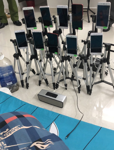 Nhiều điện thoại được nhóm của Mẫn đặt ở cạnh giường để quay lại cảnh sex. Ảnh: Công an cung cấp