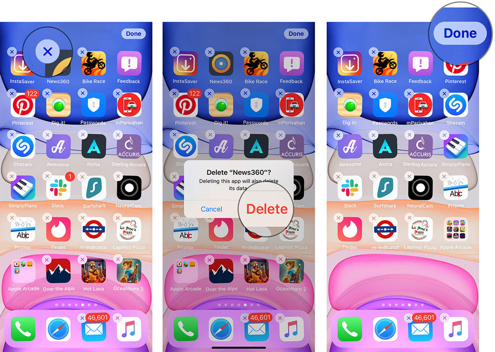 Bước 2: Tiếp theo, bạn bấm nút hình chữ X trên biểu tượng ứng dụng. Cuối cùng, bạn bấm nút chữ Delete (Xoá) màu đỏ trên hộp thoại xác nhận. Bấm nút Done (Xong) khi hoàn tất.