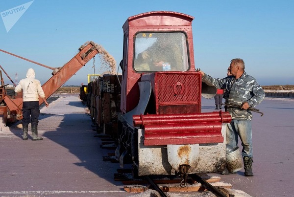 Đưa muối lên toa tàu bên hồ Sasyk-Sivash, ngoại ô Yevpatoria.