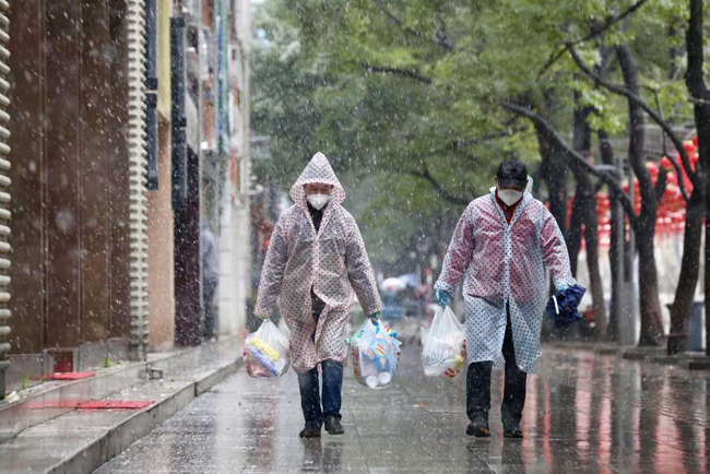 Nhiều người dân tại Vũ Hán đi bộ giữa tuyết rơi để mua đồ ăn dự trữ. Đường phố tại đây vẫn rất vắng vẻ vì lệnh phong tỏa, cấm di dời. Ảnh: China Daily.