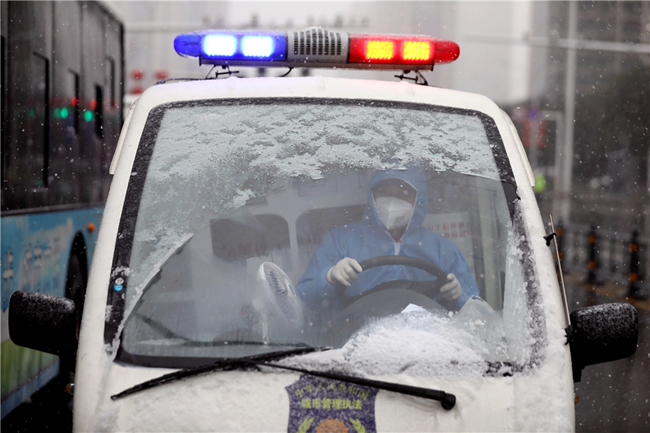 Một nhân viên y tế lái xe giữa lúc tuyết rơi để chuyển bệnh nhân viêm phổi virus corona ở Vũ Hán, ngày 15/2. Ảnh: China Daily.