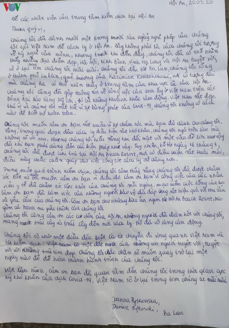 Bức thư lay động lòng người bằng những tình cảm chân tình mà nữ du khách này gửi đến y, bác sĩ, các cán bộ công an làm nhiệm vụ tại Khu cách ly người nước ngoài tập trung Beach Resort Hội An, số 1 đường Cửa Đại, thành phố Hội An.