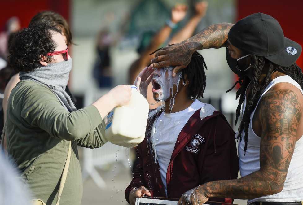Một người biểu t́nh đ̣i công lư cho George Floyd rửa mặt do hơi cay từ cảnh sát (ảnh: AP)