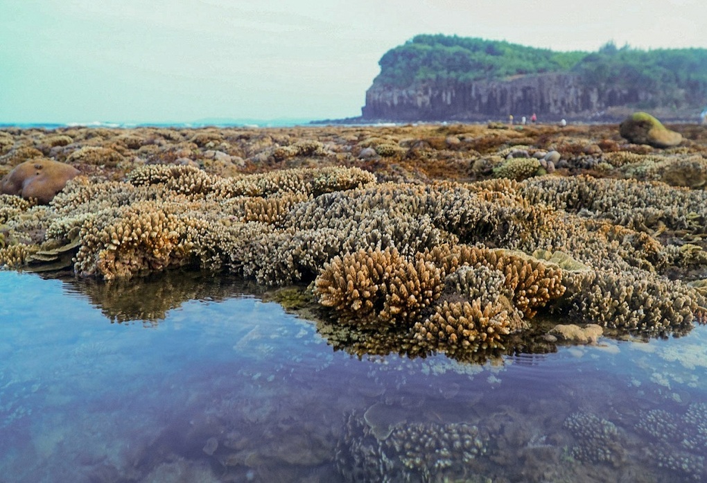 Bãi san hô Gành Yến lộ ra trên mặt biển khi thủy triều rút. Ảnh: Phạm Linh.