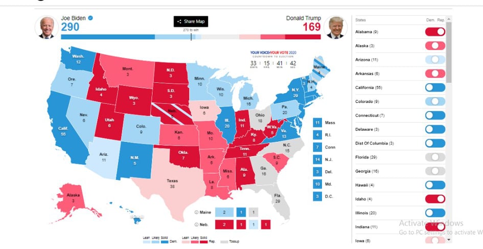 Dự đoán số phiếu đại cử tri bầu cho ông Trump và Biden tại các bang của Mỹ trên trang 270towin (ảnh chụp màn hình)