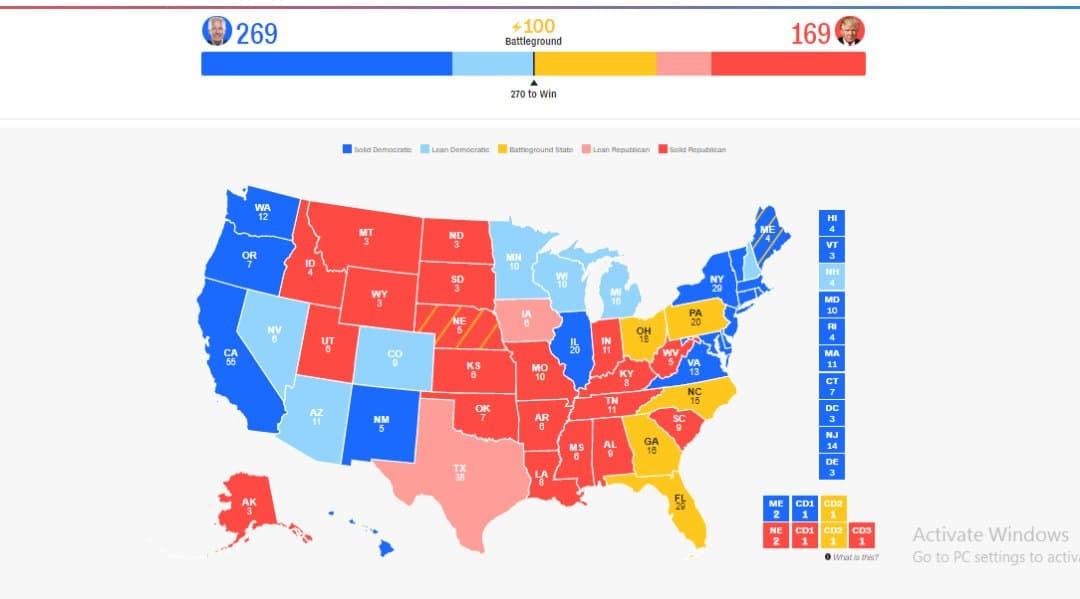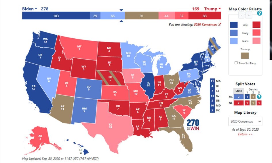 Còn theo trang 270towin, một trang tổng hợp các dự đoán của các trang khác, ông Biden cũng đang dẫn trước với khoảng cách khá xa, với 278 phiếu đại cử tri (tính gộp cả các phiếu chắc chắn, nghiêng về và có khả năng bầu). Số phiếu dự đoán cho ông Trump vẫn là 169.