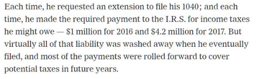 Những cái lỗ khổng lồ đó, theo luật thuế hiện hành, đều được quyền khấu trừ vào số tiền lời của những năm sau, có thể tới 10-15-20 năm sau, chẳng có ǵ bất hợp pháp hay gian trá. TTDC xúm lại khai thác việc những năm sau, ông Trump đóng rất ít thuế, nhưng lại im re về cả tỷ lỗ ông đă gánh chịu những năm trước. NYT gian trá không cho biết chi tiết TO lỗ bao nhiêu năm nào.