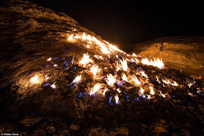 Một người dân tại đây cho biết: "Trong khu vực này có những ngọn núi với những lỗ hổng khác nhau, có hàng trăm ngọn lửa nhỏ ti ti cháy rực. Sự bốc hơi của khí tự nhiên từ sâu trong lòng đất là nguyên nhân gây ra hiện tượng bùng cháy này".