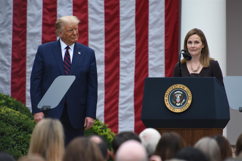 Tổng thống Trump dự lễ bổ nhiệm bà Amy Coney Barrett vào vị trí thẩm phán Ṭa án Tối cao. Ảnh: AP.