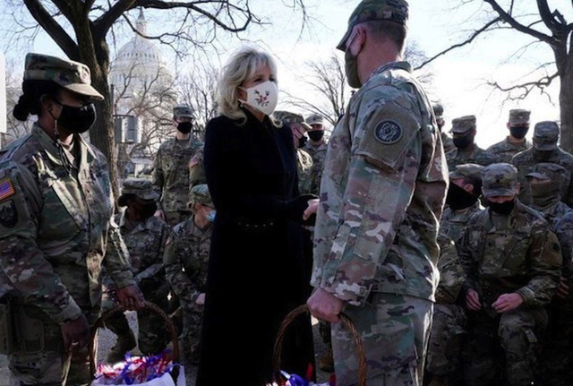 Đệ nhất Phu nhân Mỹ Jill Biden thăm một số thành viên Vệ binh quốc gia sau những gì gây tranh cãi. Ảnh: Reuters