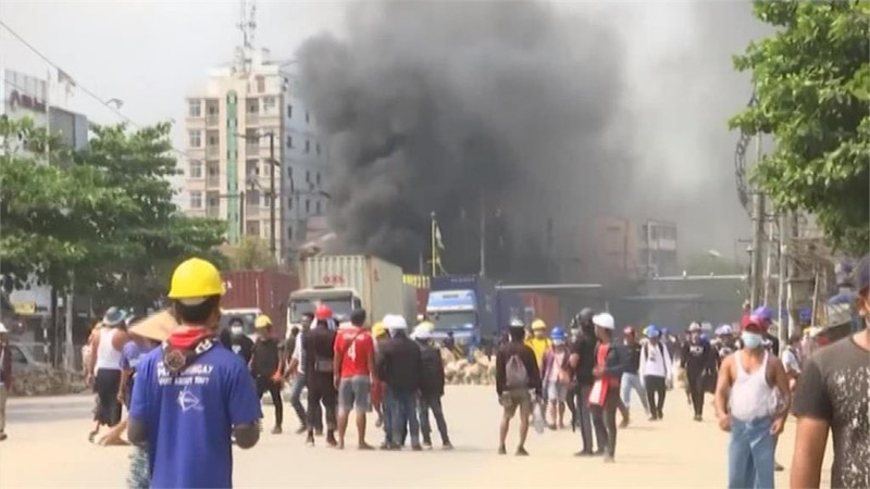 32 công ty Trung Quốc đă bị những người biểu t́nh ở Yangon đốt phá trong ngày 14/3 (Ảnh: Ifeng).
