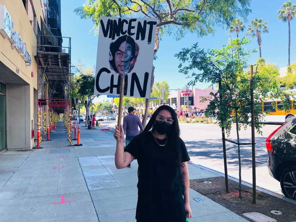 Ann Le người Việt Nam ở Los Angeles cầm một tấm biển có khuôn mặt và tên của Vincent Chin, người đàn ông Mỹ gốc Hoa bị đánh chết người năm 1982 ở gần Detroit vẫn là một điểm sáng trong phong trào chống phân biệt chủng tộc châu Á ở Mỹ. Những kẻ giết anh ta, hai người đàn ông da trắng, không phải ngồi tù và chỉ bị phạt 3.000 đô la.