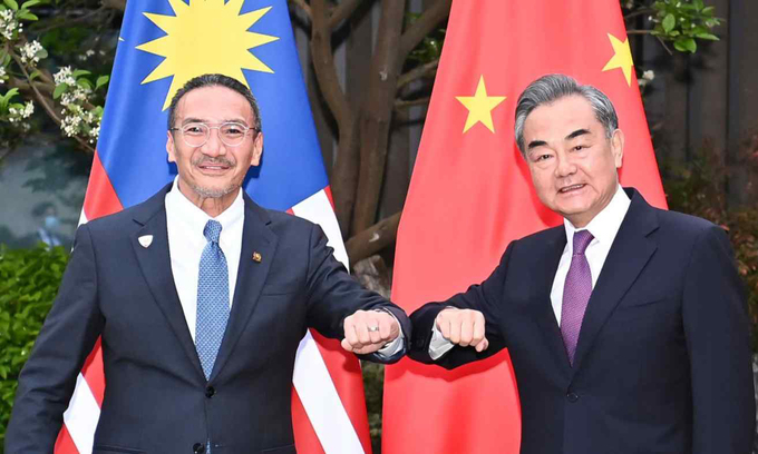 Ngoại trưởng Trung Quốc Vương Nghị (phải) chạm cùi chỏ với người đồng cấp Malaysia Hishammuddin Hussein trong cuộc gặp ở tỉnh Phúc Kiến, Trung Quốc, hôm 1/4. Ảnh: AP.