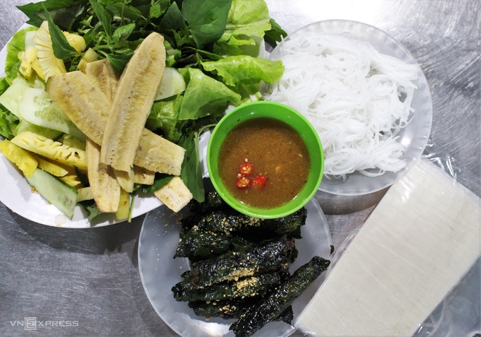 Bò nướng lá lốt cuộn bánh tráng với bún, rau sống chấm mắm nêm là món ăn chơi đổi vị cho bữa tối. Thịt nạc bò được xay nhuyễn trộn thêm thịt heo ướp gia vị hành, tiêu, tỏi, sả băm, ngũ vị hương... rồi cuộn với lá lốt tươi, đem nướng trên lửa than đỏ và liên tục bôi mỡ bò để dậy mùi thơm.