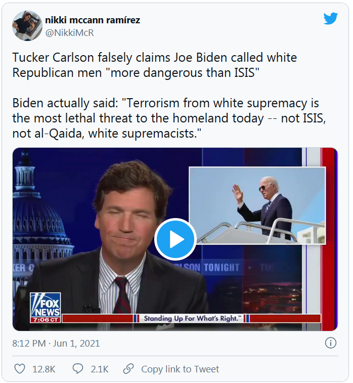 In June 2021, Fox News host Tucker Carlson claimed that President Joe Biden had warned the American public “white Republican men” are “more dangerous than Isis.”
