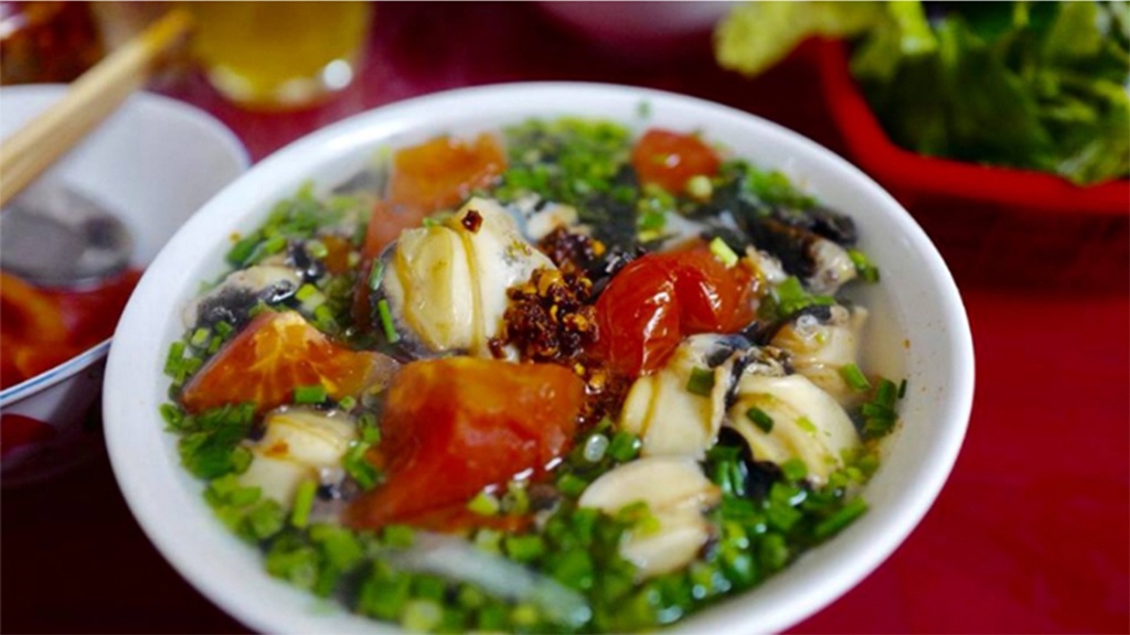 Tôi đỡ bát bún từ tay chị vẫn còn nóng hôi hổi với màu đỏ của cà chua, màu vàng của đậu rán trông thật hấp dẫn. Tôi nhặt rau sống thả vào, cho thêm chút giấm bỗng, ớt chưng và vài lát tỏi ngâm rồi trộn đều xong cũng là lúc các thứ rau, hành vừa chín tới. Múc một thìa bún cùng nước dùng, gắp vài con ốc đặt lên trên rồi nhẹ nhàng đưa vào miệng thưởng thức, tôi cảm nhận được hương vị rất đặc trưng.