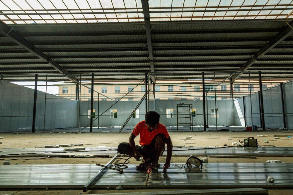 Một người lao động làm việc tại trung tâm cách ly Covid-19 mới ở Muse, gần biên giới Trung Quốc - Myanmar. Ảnh: AFP