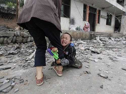 Cậu bé ôm chân mẹ than khóc trước ngôi nhà bị động đất phá hủy. Trận động đất cường độ 6,6 độ Richter Scale xảy ra tại làng Long Môn, quận Lộc Sơn, tỉnh Tứ Xuyên, Trung Quốc. Ảnh: Reuters