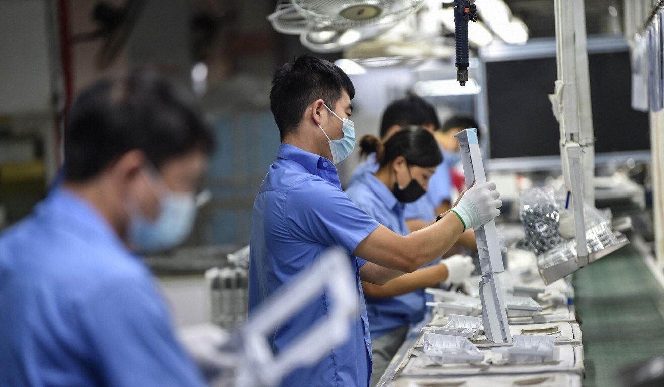 Công nhân sản xuất các bộ phận của máy giặt tại một nhà máy ở Nam Kinh, thuộc tỉnh Giang Tô, miền đông Trung Quốc. Ảnh: AFP