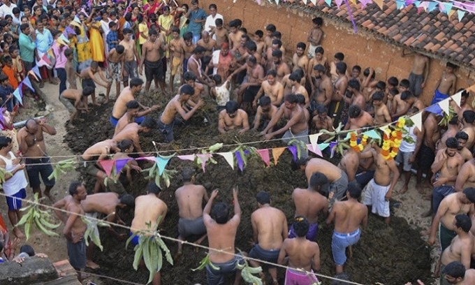 Dân làng Gumatapura hào hứng tham dự lễ hội ném phân bò Gorehabba, đánh dấu kết thúc Diwali, một trong những lễ hội Hindu giáo quan trọng nhất.