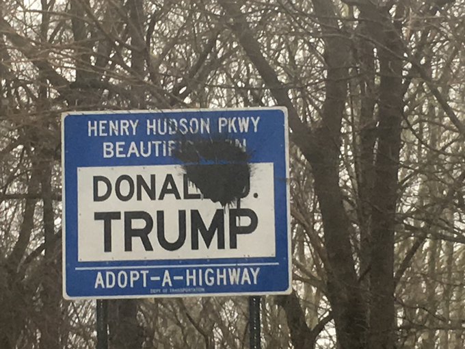 The sign bearing Trump's name on Henry Hudson Parkway, in west Manhattan, was paid for by the Trump Organization as part of the New York Department of Transportation's "Adopt-A-Highway" scheme, through which organizations or individuals can pay to sponsor road signs in the city.