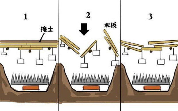 Bên trong những chiếc hố này đặt rất nhiều những thanh kiếm dài và vô vàn những loại vũ khí sắc nhọn khác nhau. Bên trên hố được đậy kín bằng một tấm ván gỗ. Phía dưới tấm ván treo một vật nặng tương đương sức nặng của một người trưởng thành, phía trên tấm ván được bao phủ, "ngụy trang" bằng một thứ tựa như những tấm gạch lát nền.