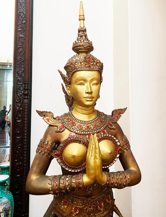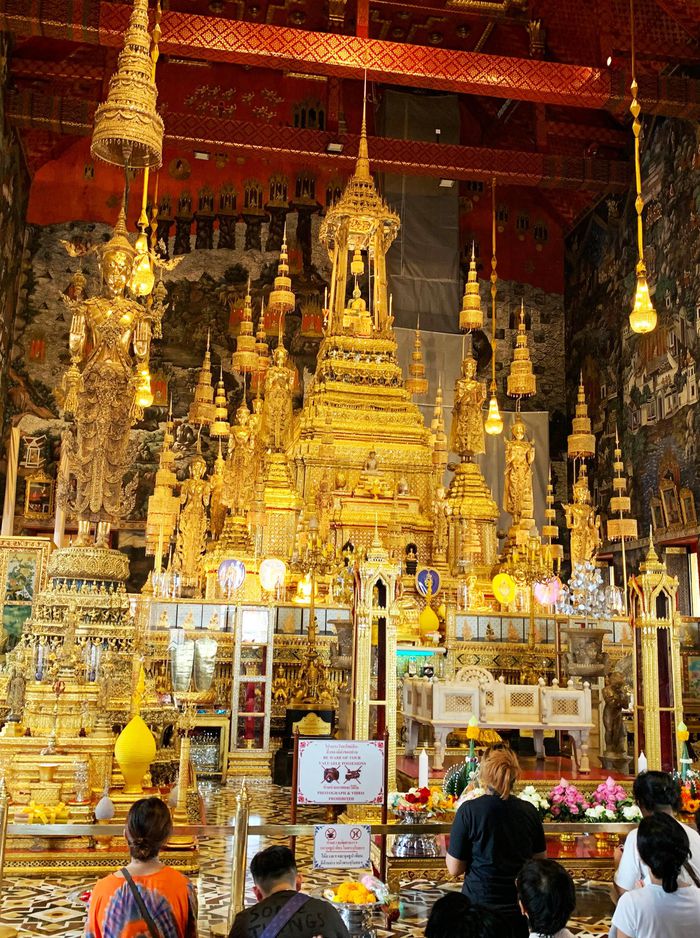 Trong quần thể kiến trúc của hoàng cung, Phra Sri Rattana là ngôi tháp lớn nhất, mang h́nh một ngọn núi, được bao bọc bởi hàng triệu lá vàng dát mỏng chuyển về từ Italia; xung quanh là tượng những chú voi linh thiêng của Thái Lan. Khi ánh sáng mặt trời chiếu rọi vào các ngôi tháp, hoàng cung vàng rực, tỏa sáng lấp lánh cả một vùng.