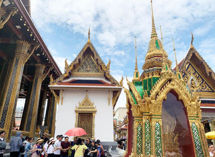 Nằm trong top 10 cung điện hoàng gia xa hoa nhất thế giới, đại hoàng cung Grand Palace là điểm tham quan nổi tiếng, thu hút du khách hàng đầu Thái Lan. Cung điện càng lung linh hơn khi vô số lá vàng dát trên các ngọn tháp phản chiếu ánh nắng mặt trời.