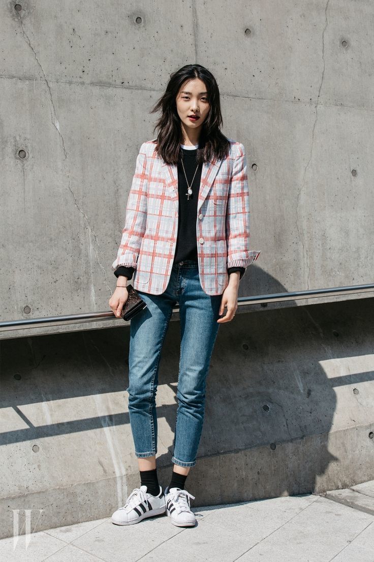 Chiếc áo blazer kẻ caro nhỏ còn được các sao Hàn lăng xê nhiệt tình.