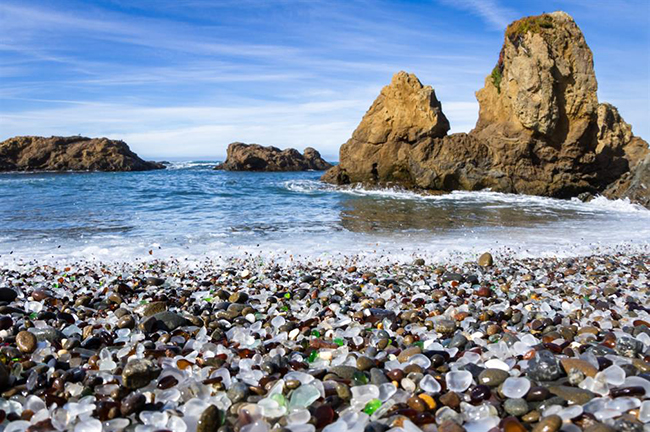 Băi biển pha lê, California: Bờ biển California là những băi biển cát vàng, nhưng ở đây c̣n có băi biển pha lê được t́m thấy bên cạnh công viên bang MacKerricher. Những viên pha lê này chính là thủy tinh vỡ cùng các loại rác khác được làm nhẵn và tṛn bởi các làn sóng biển và tích tụ lại trên bờ.