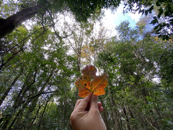 Dù vậy, tôi cũng không quên ngắm nhìn những loài hoa trái dọc đường. Vài cây phong đang trút lá vàng nổi bật giữa những tán rừng xanh. Vài loại quả đủ loại xanh đỏ tím vàng màu sắc bắt mắt, bạn tôi cảnh báo ngay rằng chỉ chụp hình thôi đừng dại dột đụng vào hay ăn thử, ngửi thử. Ngay cả tên gọi của chúng bọn tôi còn không biết, đương nhiên không dám mạo hiểm rồi. Chúng tôi còn trầm trồ không ngớt với những cây gỗ to phủ đầy rêu xanh, sừng sững vươn cao ngạo nghễ.
