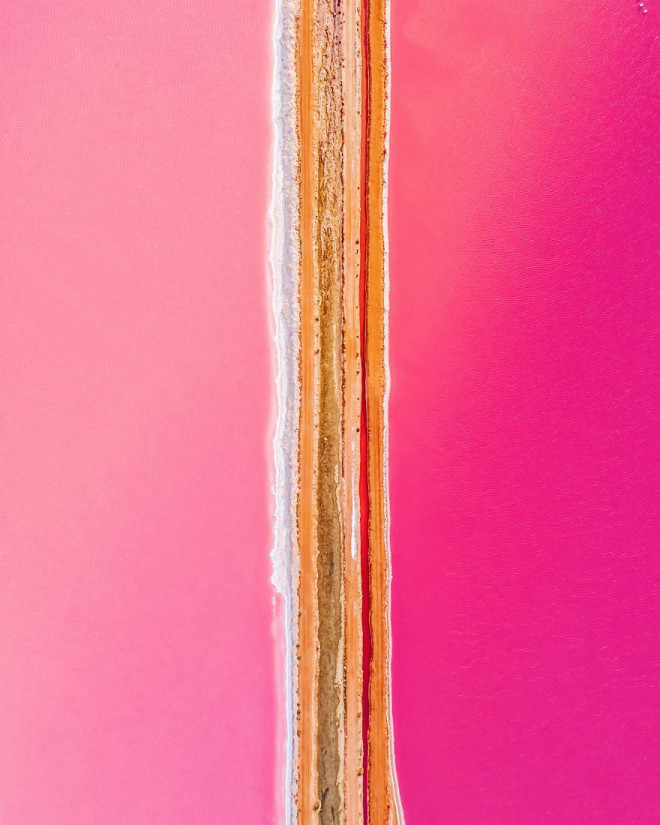 Muối hồng trên bờ hồ lấp lánh như tuyết và tất cả trông giống như những bức tranh trừu tượng. Trong trường hợp này, thiên nhiên và màu sắc đã làm nên điều kỳ diệu.