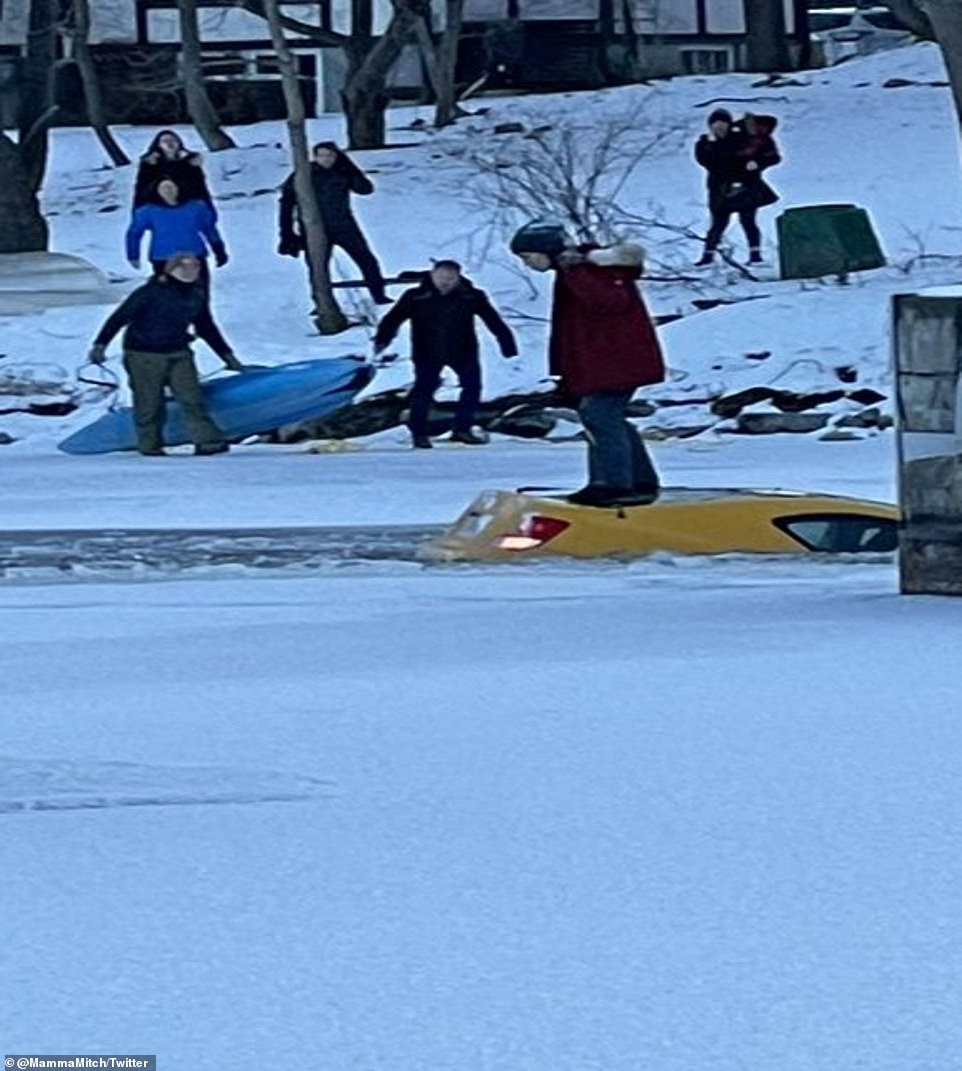 Không lâu sau, lớp băng trên mặt nước vỡ ra, khiến người phụ nữ mắc kẹt, phải trèo lên nóc xe hơi.